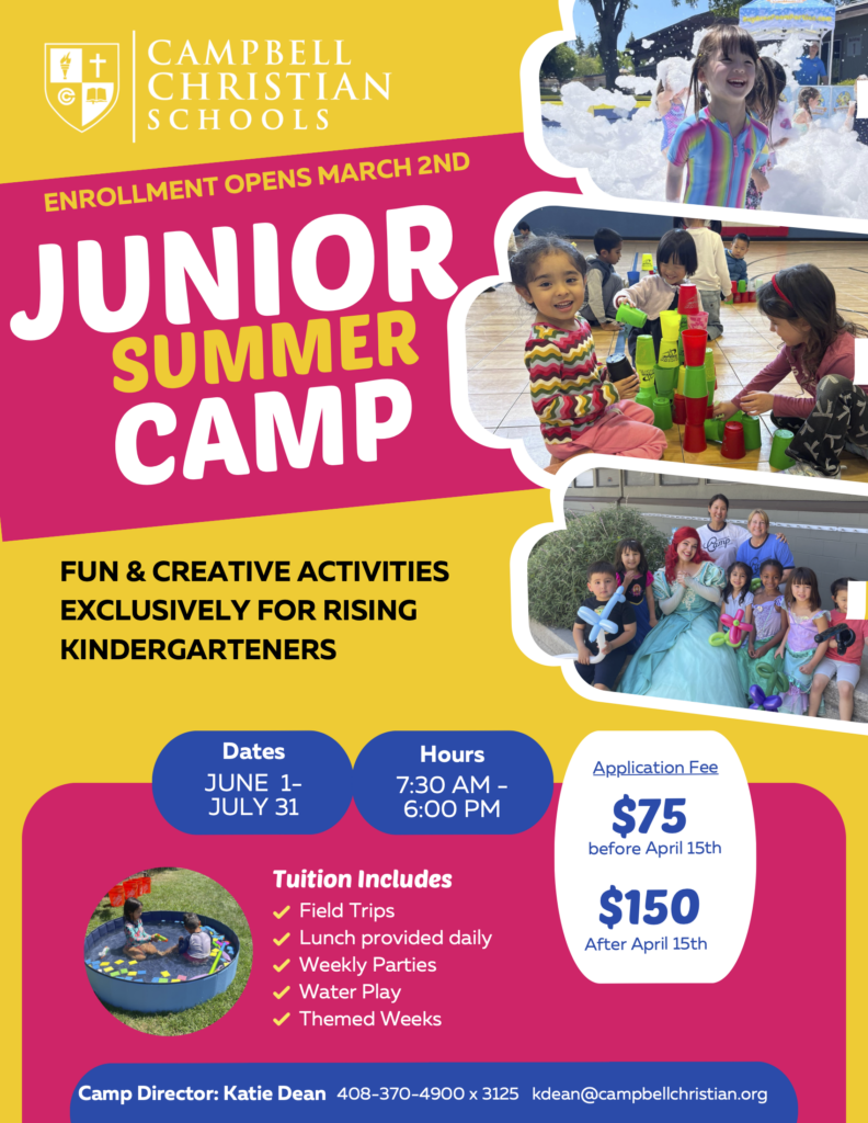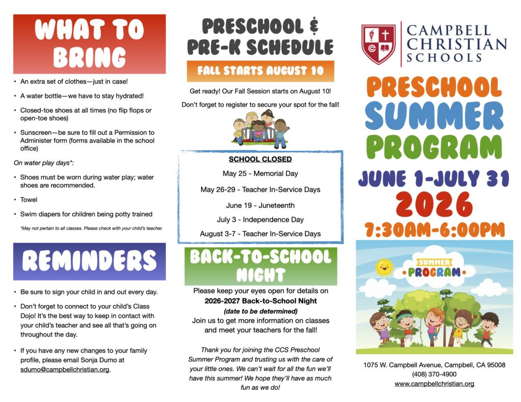If your child has yet to complete Pre-K or TK, please contact our Preschool Director, eknickerbocker@campbellchristian.org, to learn more about our specialized preschool summer programs.