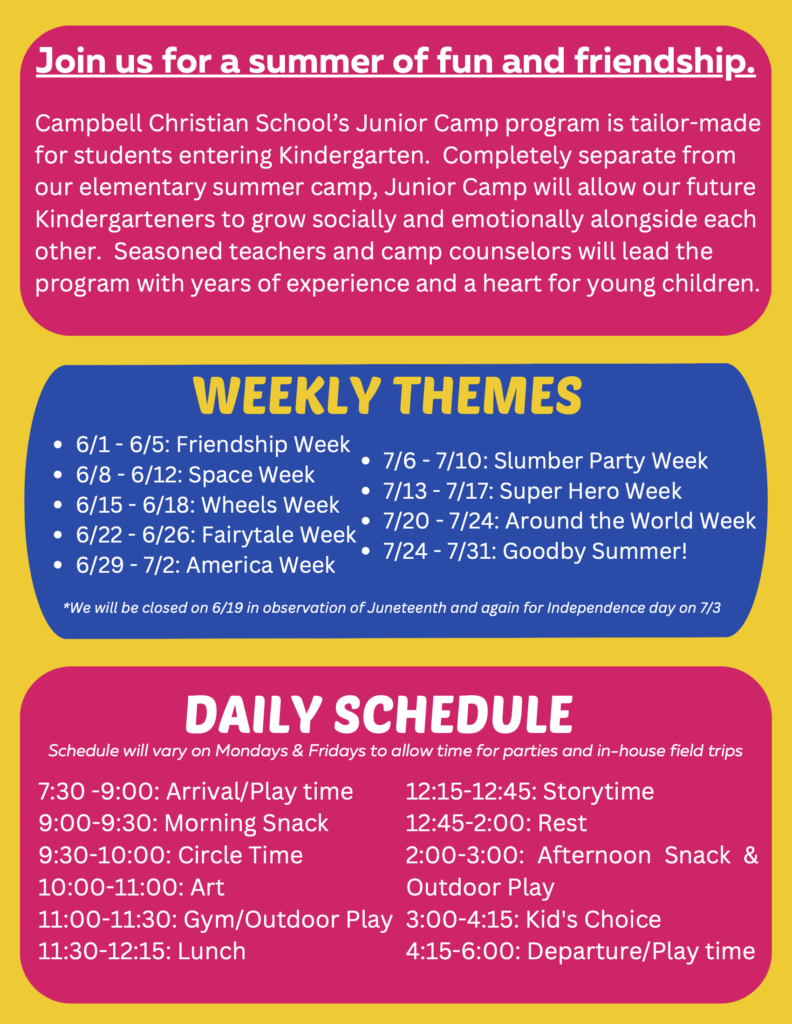 Campbell Christian School’s Junior Camp is a program tailor-made specifically for students entering Kindergarten. By remaining completely separate from our elementary summer camp, Junior Camp allows our future Kindergarteners to grow socially and emotionally alongside their peers in an environment built just for them.