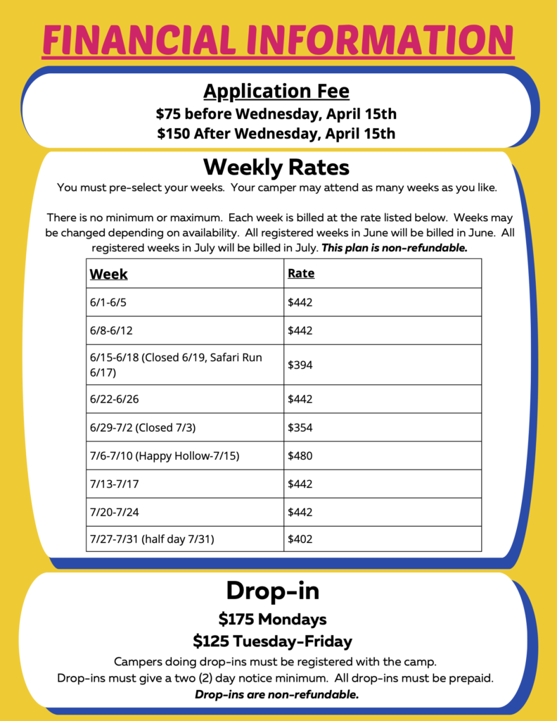 Note: You must pre-select your weeks. Your camper may attend as many weeks as you like! This plan is non-refundable